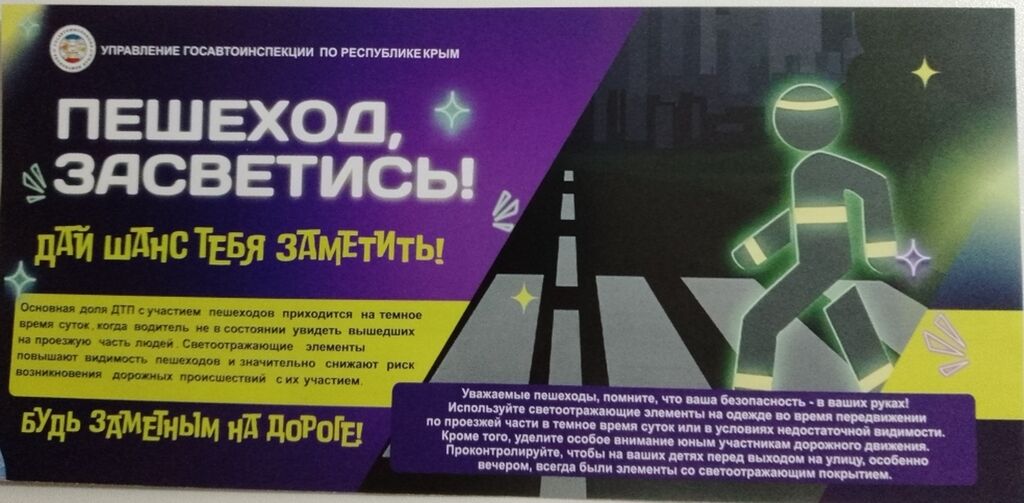 В целях обеспечения безопасности пешеходов Управление Госавтоинспекции России по Республике Крым напоминает об использовании светоотражающих элементов в одежде!